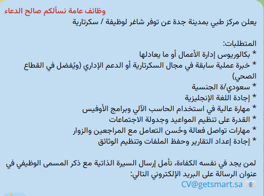 على من تنطبق عليه الشروط أعلاه، يرجى إرسال السيرة الذاتية مع كتابة مسمى الوظيفة (سكرتارية – جدة) في عنوان البريد الإلكتروني : تقدم الأن